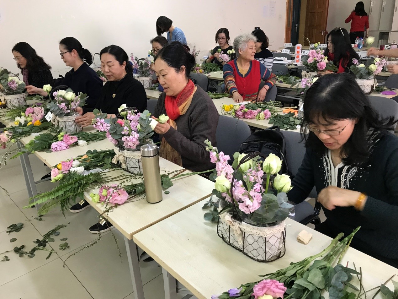 3月23日周六下午1:30, 院工会主席仇学琴带领花卉公司培训老师和助理把各类花材搬到文津楼212教室,开始布置培训现场。2:30分,女教职工来到教室,在已经摆放好花篮、剪刀、各类花材的座位上坐好。
