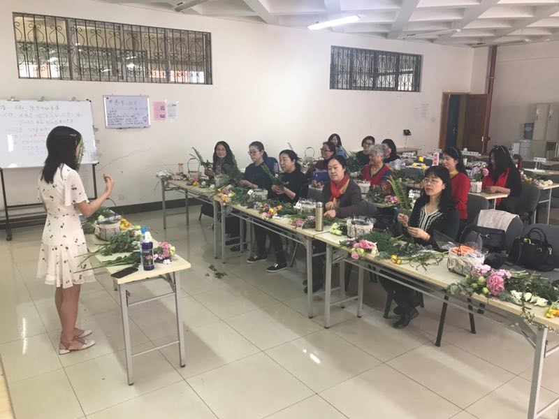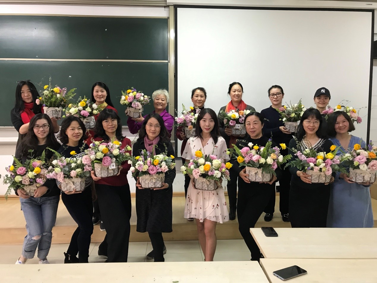 工会为了迎接2019年“三八”妇女节,别出心裁地组织了女教职工插花培训活动。