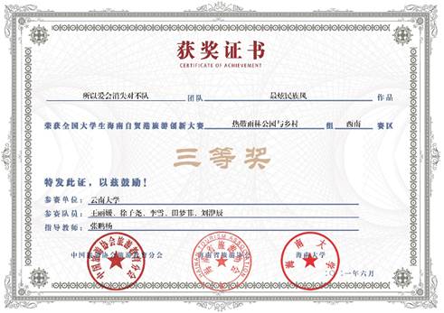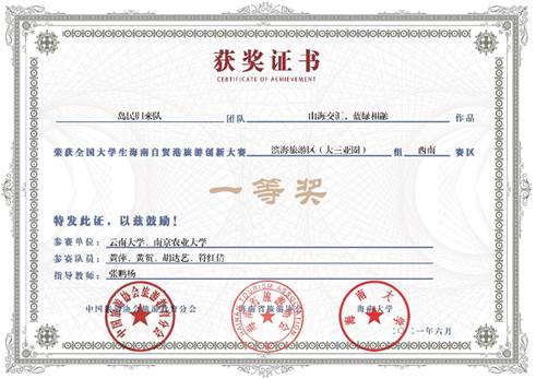 近日,“全国大学生海南自贸港旅游创新大赛”圆满落幕,我院2019级旅游管理专业本科生黄萍等团队作品《山海交汇,蓝绿相融》荣获西南赛区一等奖,2019级会计学专业本科生王丽媛等团队作品《最炫民族风》荣获西南赛区三等奖,旅游管理系教师张鹏杨获得“优秀指导老师”称号。