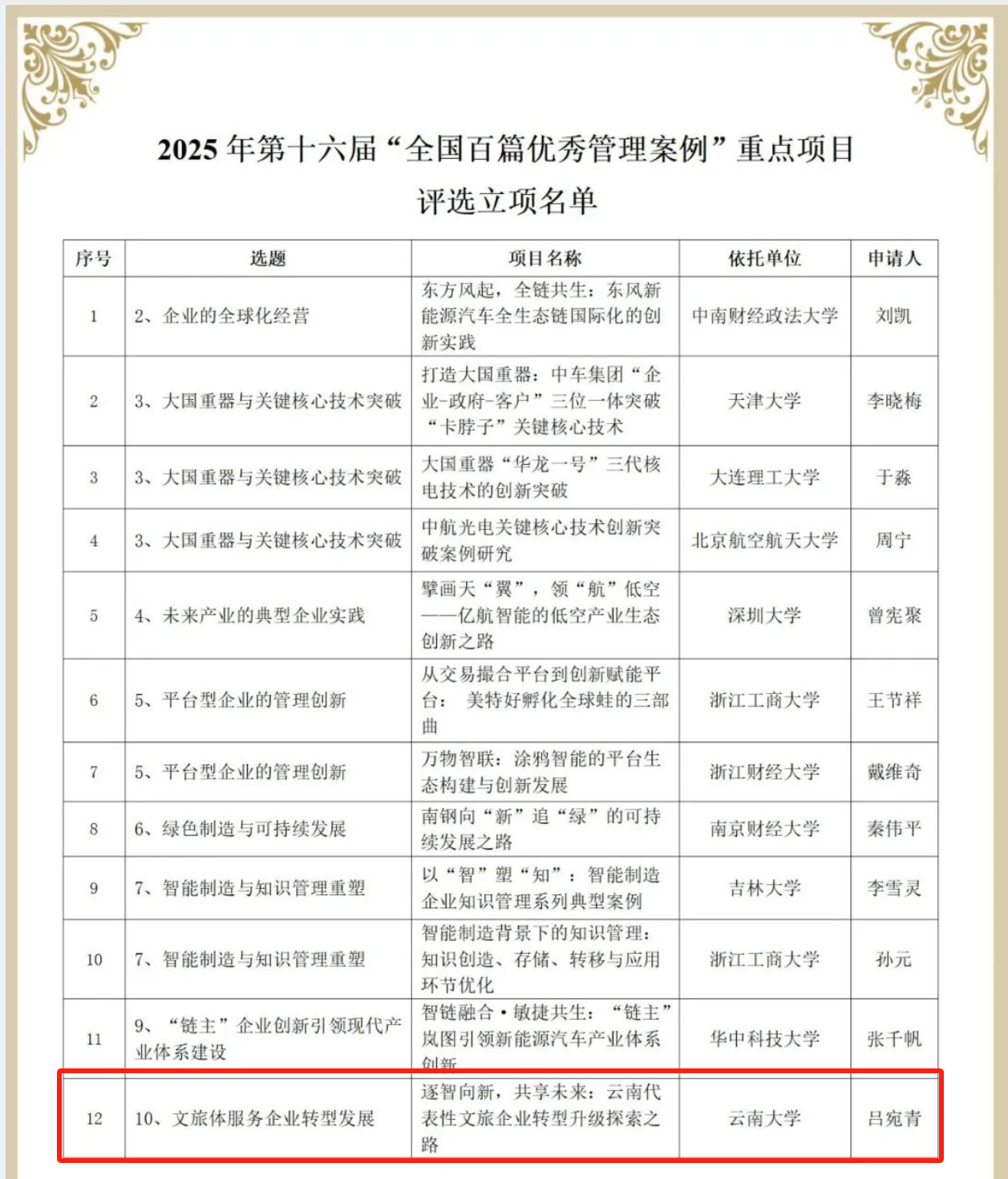 4月27日,在浙江大学管理学院由中国管理案例共享中心组织的第十六届“全国百篇优秀管理案例”重点项目立项评审中,全国共12个项目通过评审获得立项。其中,我院吕宛青教授团队(成员:孔莉、赵书虹、倪向丽、邓伟升、宋乐、陈伟、陈曦)申报的重点案例建设项目《逐智向新,共享未来:云南代表性文旅企业转型升级探索之路》经现场答辩和评审专家投票通过获得立项。这是自该重点项目设立以来云南大学首次获批立项,是我校工商管理学科建设的一项重大突破。