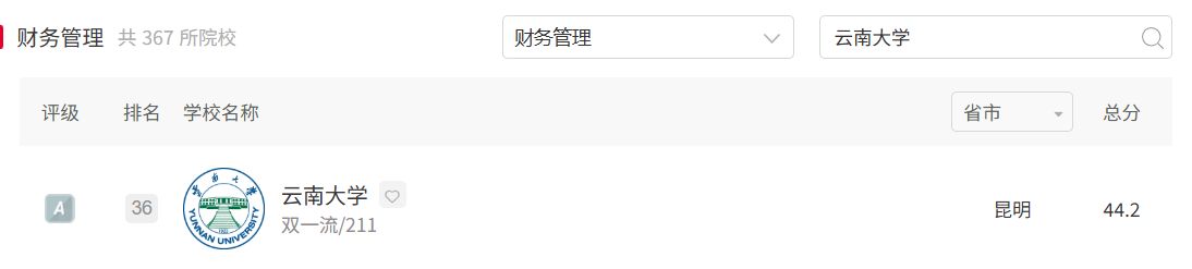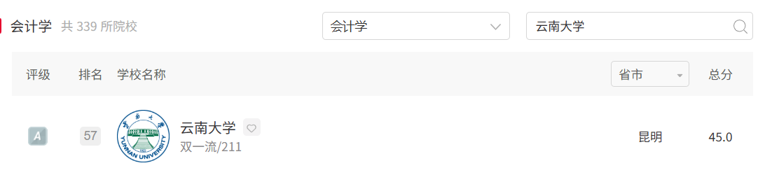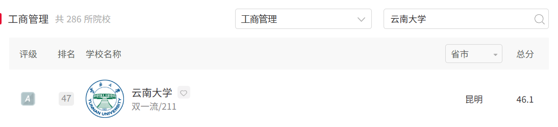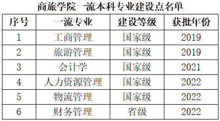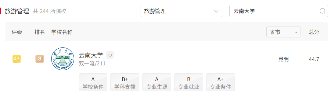 6个本科专业全部参评,最终取得1个A+、5个A的评级成绩,所有专业排名均位列省内第一,其中旅游管理专业是云南省7个A+专业之一,云南大学3个A+专业之一。各专业排名具体情况如下:旅游管理专业评级A+,排名全国第3;工商管理专业评级A,全国排名第47;人力资源管理专业评级A,全国排名第24;物流管理专业评级A,全国排名第25;财务管理专业评级A,全国排名第36;会计学专业评级A,全国排名第57。